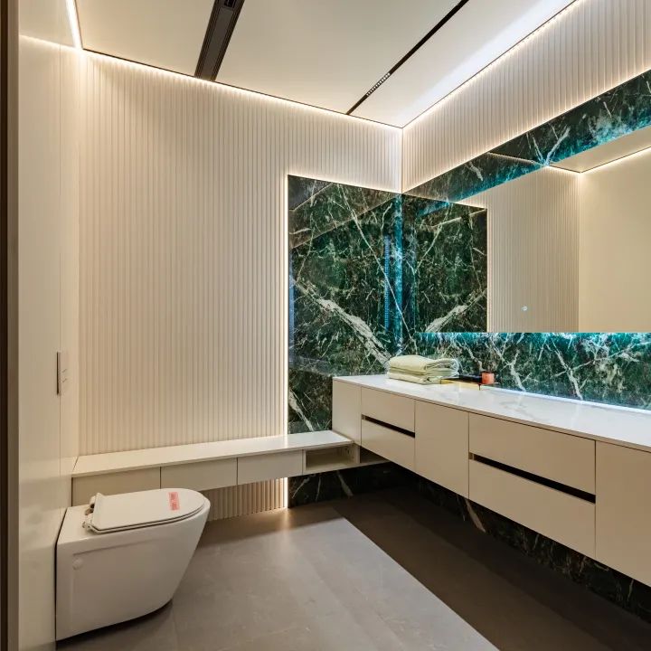 衛浴間(jiān)以純白(bái)為(wèi)底色,