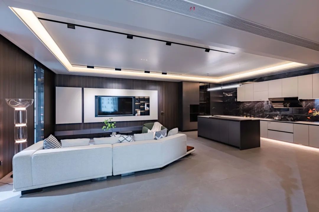 客廳給聚會(huì)的(de)親友(yǒu)營造輕松歡聚的(de)空(kōng)間(jiān)環境,懸浮式的(de)大(dà)✘闆吊頂,空(kōng)間(jiān)層次感強,開(kāi)燈後錯(cuò)落有(yǒu)緻,極具氛圍感。
