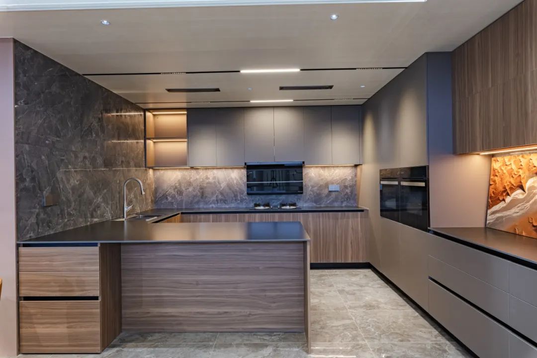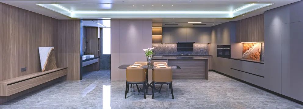 整間(jiān)廚房(fáng)選用(yòng)深胡桃木(mù)紋色搭配太空(kōng)灰,在暖色光(guāπng)源的(de)烘托下(xià),顯得(de)溫馨且不(bù)失高(gāo)級質感。