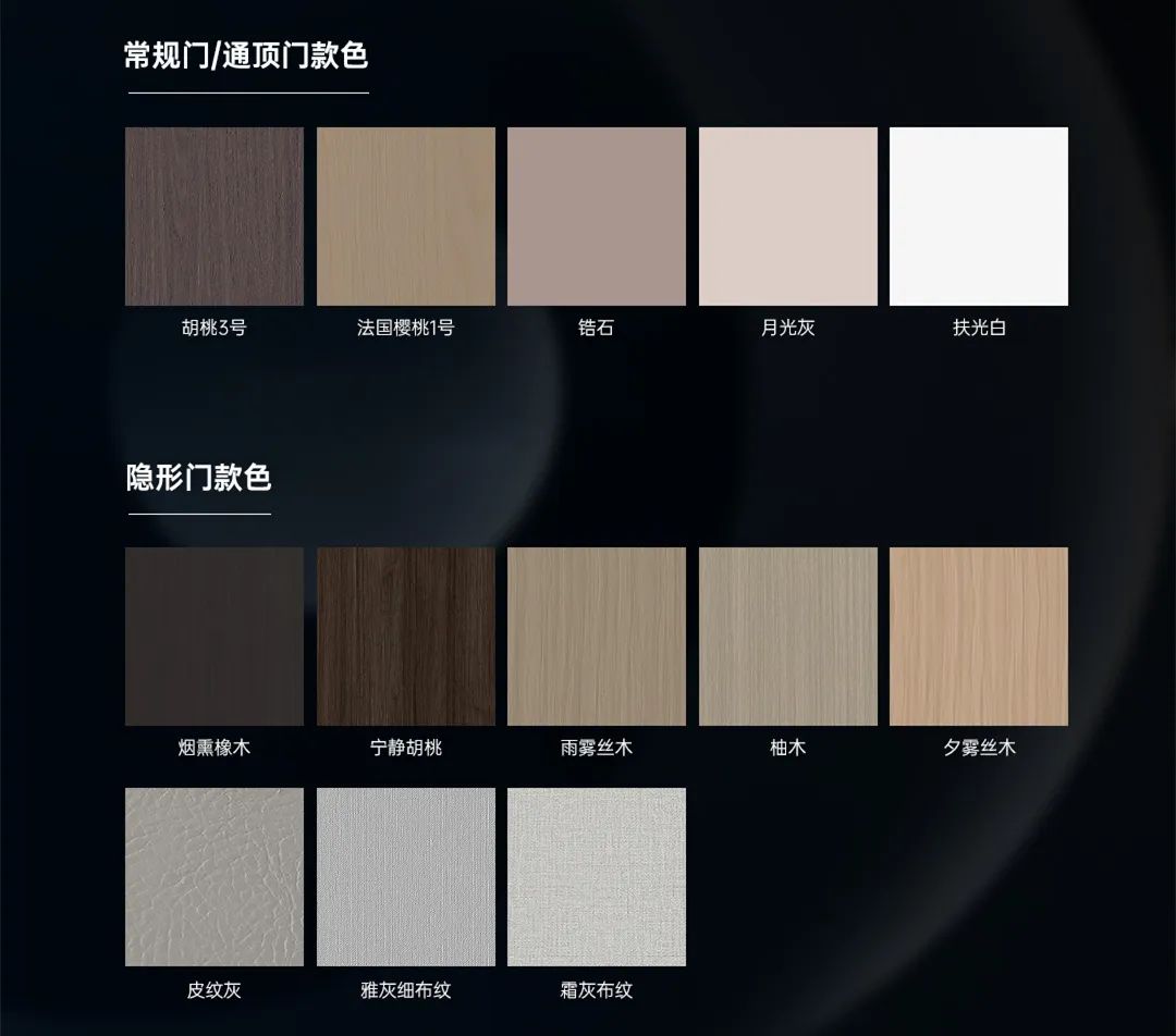 甄選多(duō)種家(jiā)裝主流色,滿足更多(duō)場(chǎng)景更多(duō)風(fēng)格的(de)設計(jì§)搭配。更可(kě)頂/牆/門(mén)/櫃同色設計(jì),整體(tǐ)交付無色差,讓家(jiā)更顯和(h'é)諧美(měi)觀。