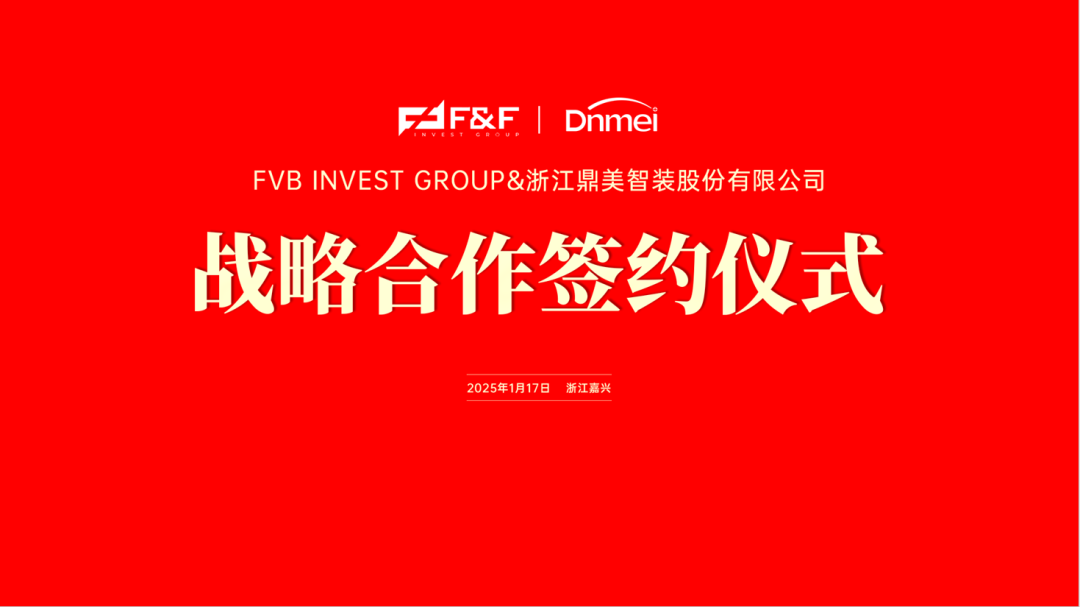 FVB INVEST GROUP與浙江鼎美智裝股份有限公司在鼎美(měi)總部舉行(xíng)戰略合作(zuò)簽約儀式。FVB INVEST GROUP董事₹(shì)長(cháng)陳國(guó)勝、浙江鼎美智裝股份有限公司董事(shì)長(cháng)張轲出席簽約儀式。