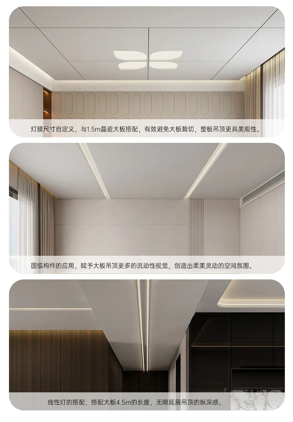 當晶瓷大(dà)闆與燈膜、圓弧型材、線性燈等不(bù)同的(de)頂面裝飾件(jiàn)搭配組合,吊頂不>(bù)再是(shì)千篇一(yī)律的(de)單調,而是(shì)有(yǒu)了(le)千變萬化(huà)的(de)可(kě)能(nén₽g)。
